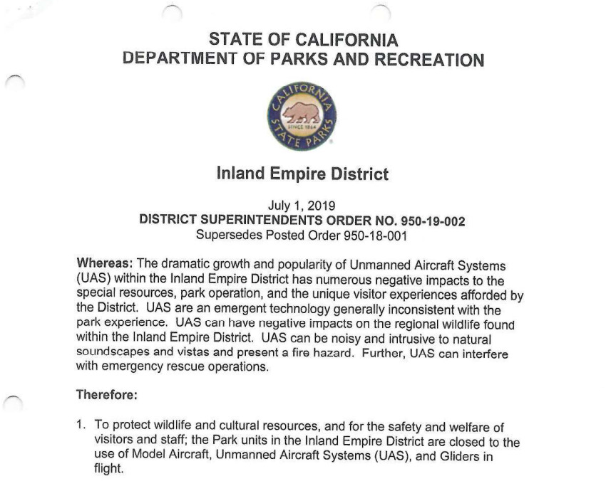 Parks units in the Inline Empire District are closed to the use of model aircrafts and unmanned aircraft systems.