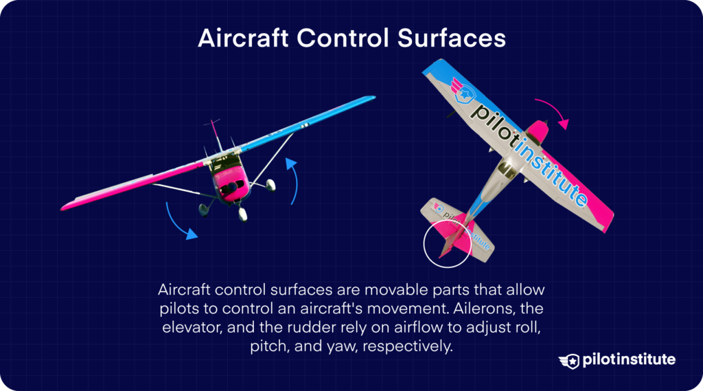 Control surfaces such as the aileron, elevator, and rudder require airflow over the surface to change the aircraft’s roll, pitch, and yaw, respectively.